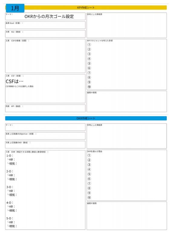 まず、OKRは年間目標として、社長と部門長で決めています。そこから部門ごとの KGI(月単位目標)を設定し、個人のKPIに落とし込むまでは部門長が行います。この個人のKPIをG-POPシートのGoalに設定し、それぞれが週次の行動(Pre)を考えます。例えば、営業職の場合、目標となる粗利金額がKPIとして決まれば、「その達成のために新規獲得を何件すべきか」「そのためには今週、何件の架電が必要か」と、具体的な行動量へと逆算します。