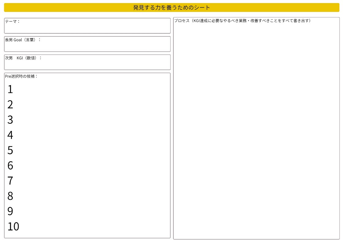 このPreの解像度をあげるために、オリジナルの「発見シート」も活用しています。タスクを洗い出し、今本当に取り組むべきものを発見し選択する力を養うためです。