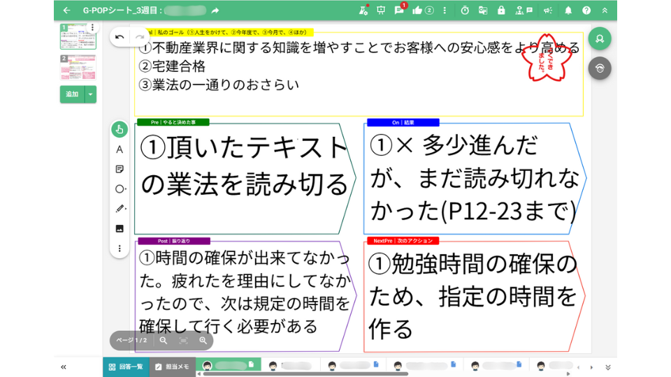 國松:難関国家資格の通信教育を提供するフォーサイト社の5回の模擬試験に向けて、同社の教材で取り組む範囲をG-POPシートに記入していきました。参加者を3チームに分け、業務後に週1回G-POPぐるりを行いました。ファシリテーターには宅建士でありキャリアコンサルタントでもある小峯久実さんを迎え、学習進捗の確認だけでなく、メンタル面のサポートも手厚く行いました。