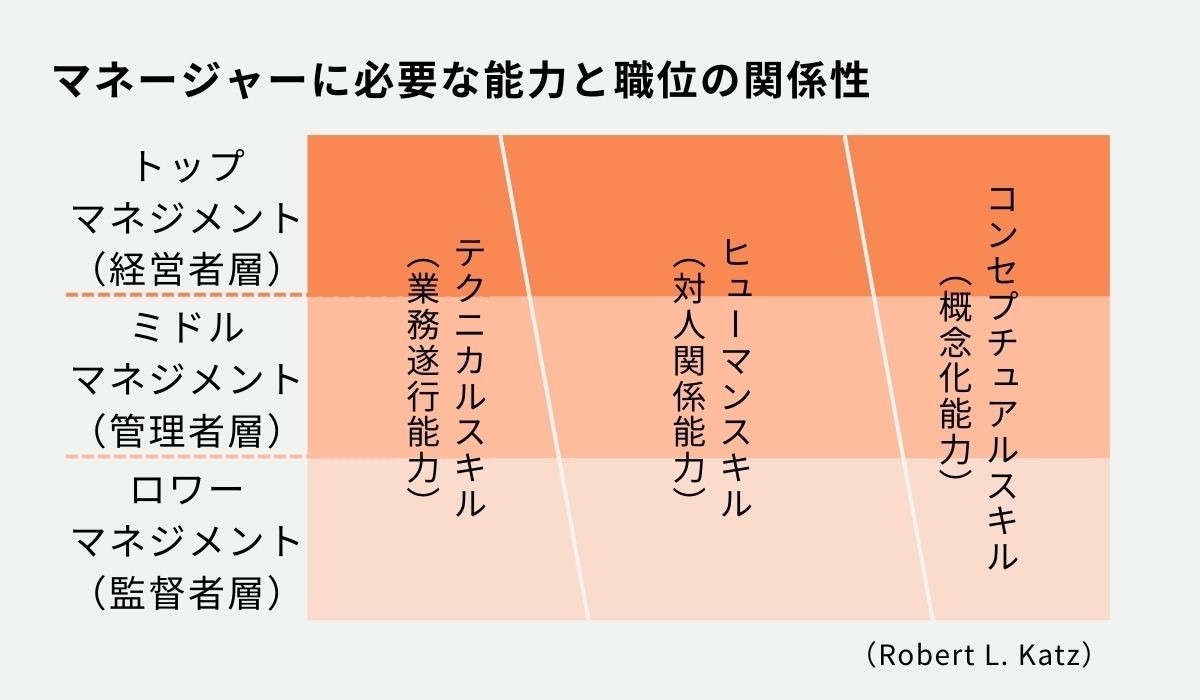 管理職に必要なスキルを体系的に理解するために、ロバート・カッツが提唱した「カッツ・モデル」というフレームワークが役立ちます。役職が上がるにつれて、求められるスキルの比重は変化します。