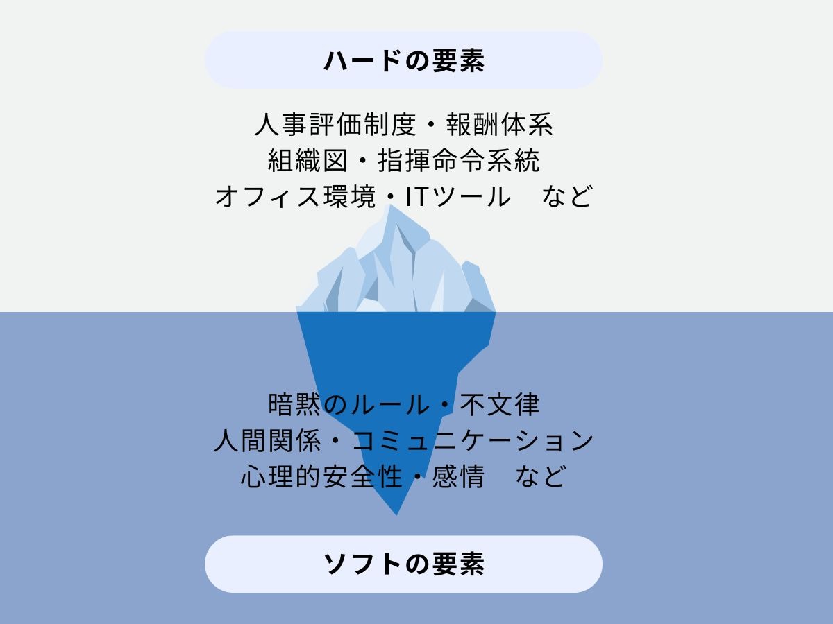 よく用いられるのが「氷山モデル」です。水面上に見えているハードな要素と、水面下に隠れている巨大なソフトな要素が、相互に影響し合って組織の実態を形作っています。