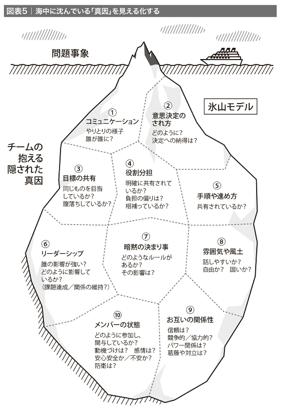 組織開発で直視すべきは、図のような氷山の下です。「ミスが多い」「会議が静か」といった現象(結果)の水面下には、必ず不信感や諦めといった真因が潜んでいます。『星の王子さま』に「大切なものは目に見えない」とありますが、組織も同じです。勇気を持って水面下の真因を見える化することこそが、組織開発の第一歩だと中原氏は語ります1。