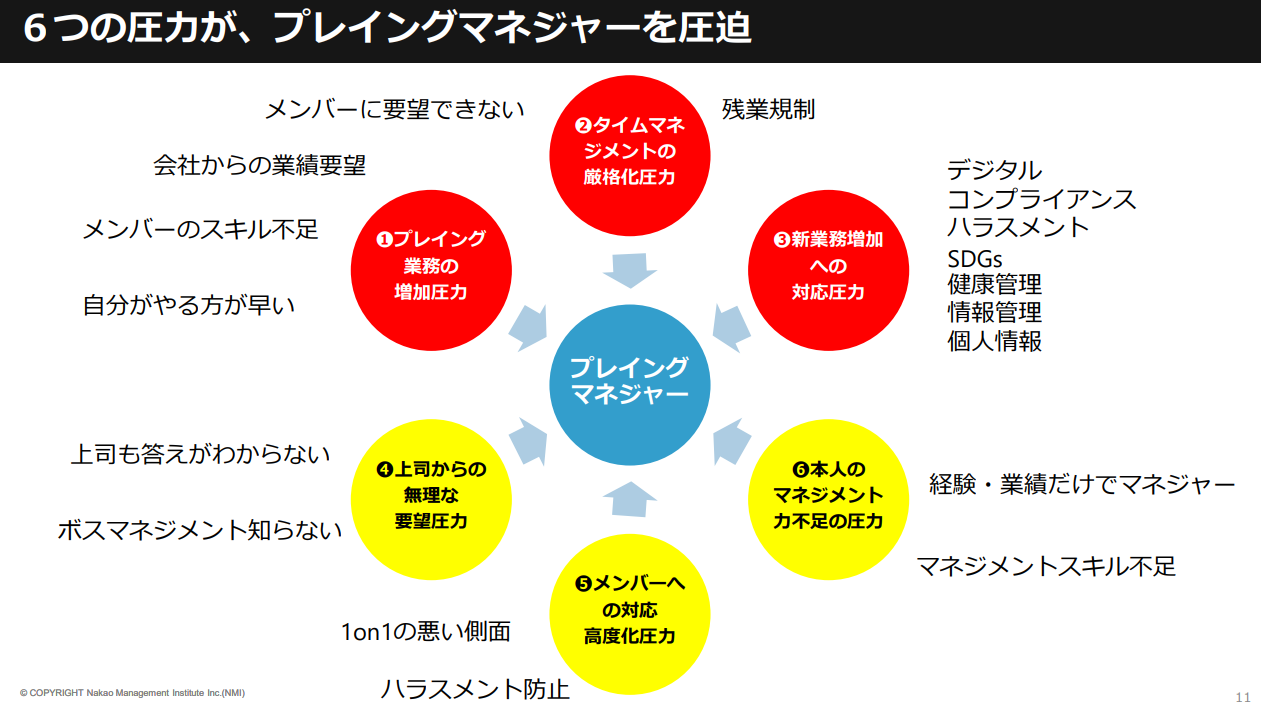 では、残りの7割をマネジメントに充てるとして、具体的にどうすればいいのでしょうか? 実は、プレイングマネージャーには6つの圧力がかかっているため「無理ゲー」のような状態になっていることが多いのです。