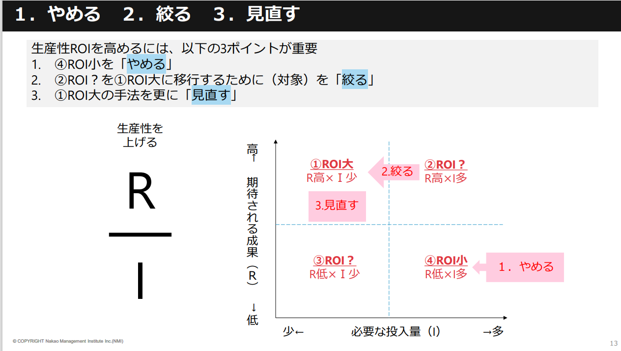例として、当たり前にやっていることの中で、やめた方が良いことを左側に、生産性を高めるためにやった方が良いことを右側に示しました。業務を見直し、「やめる」「絞る」を継続的に実践することで、生産性を維持・向上させることができます。