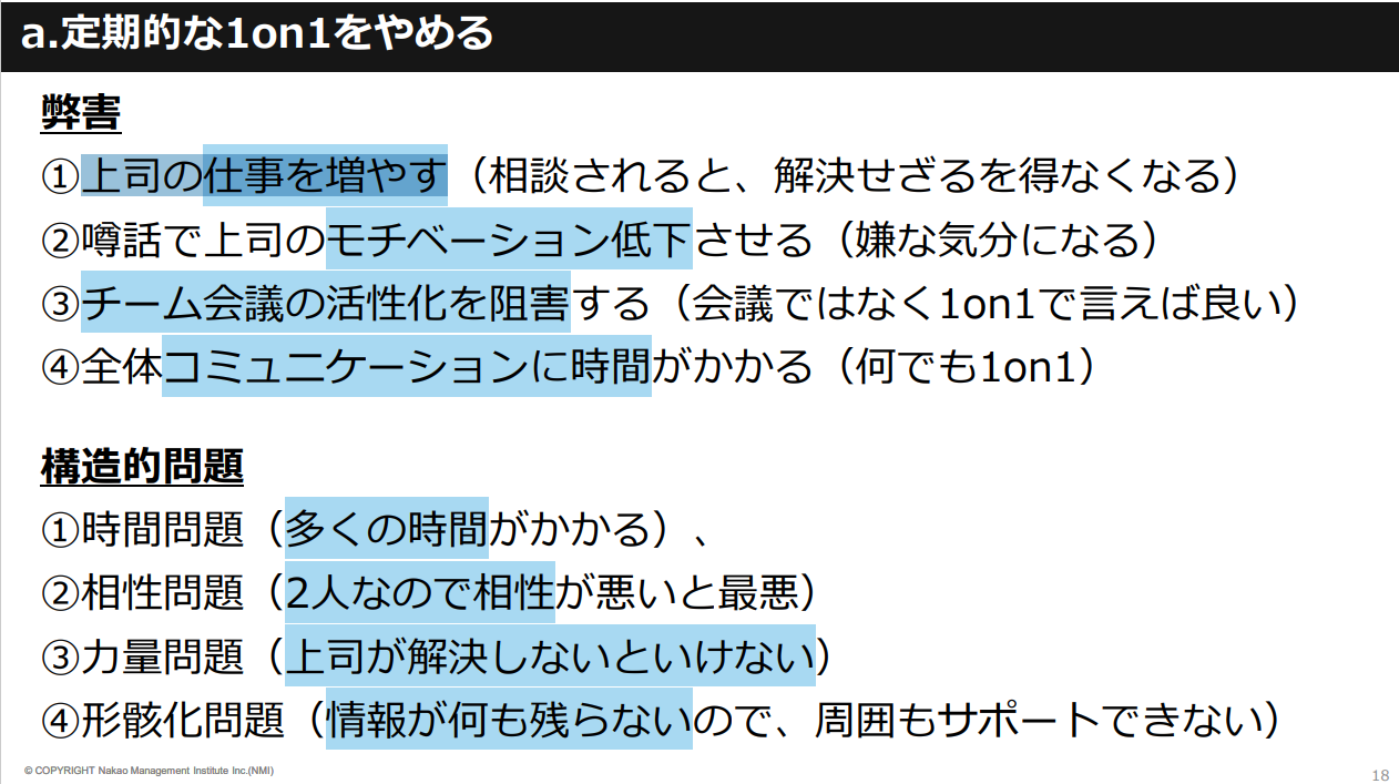 今回はその中でも一番上の「定期的な1on1をやめる」という解決策について説明します。