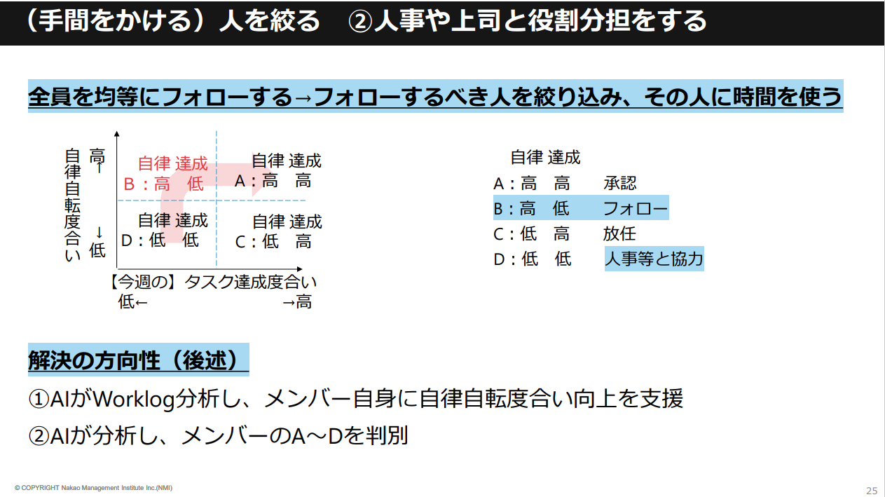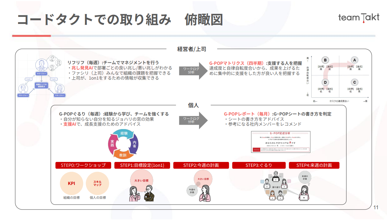 メンバーに対して、「丁寧にフォローすべき」「承認して任せて良い」「自由にさせて良い」「基礎教育を行うべき」などの適切な対応が分かるので、注力すべき人材を明確にし、プレイングマネージャーの業務負担を軽減します。こういったことをコードタクト社ではAIを使って効率化する開発をされています。
