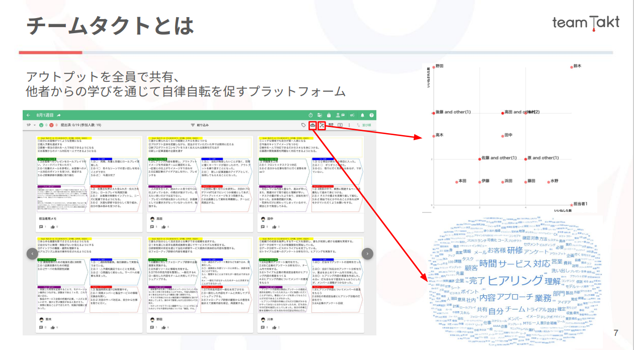 従来の週報管理では、個別ファイルで確認する手間や分析の難しさが課題でした。しかし、チームタクトでは、全員分の週報を一覧表示することができ、コメントや「いいね」で交流しながら、行動ログを取得できます。このプラットフォームを通じて、メンバー同士の学び合いを支援するサービスとなっています。