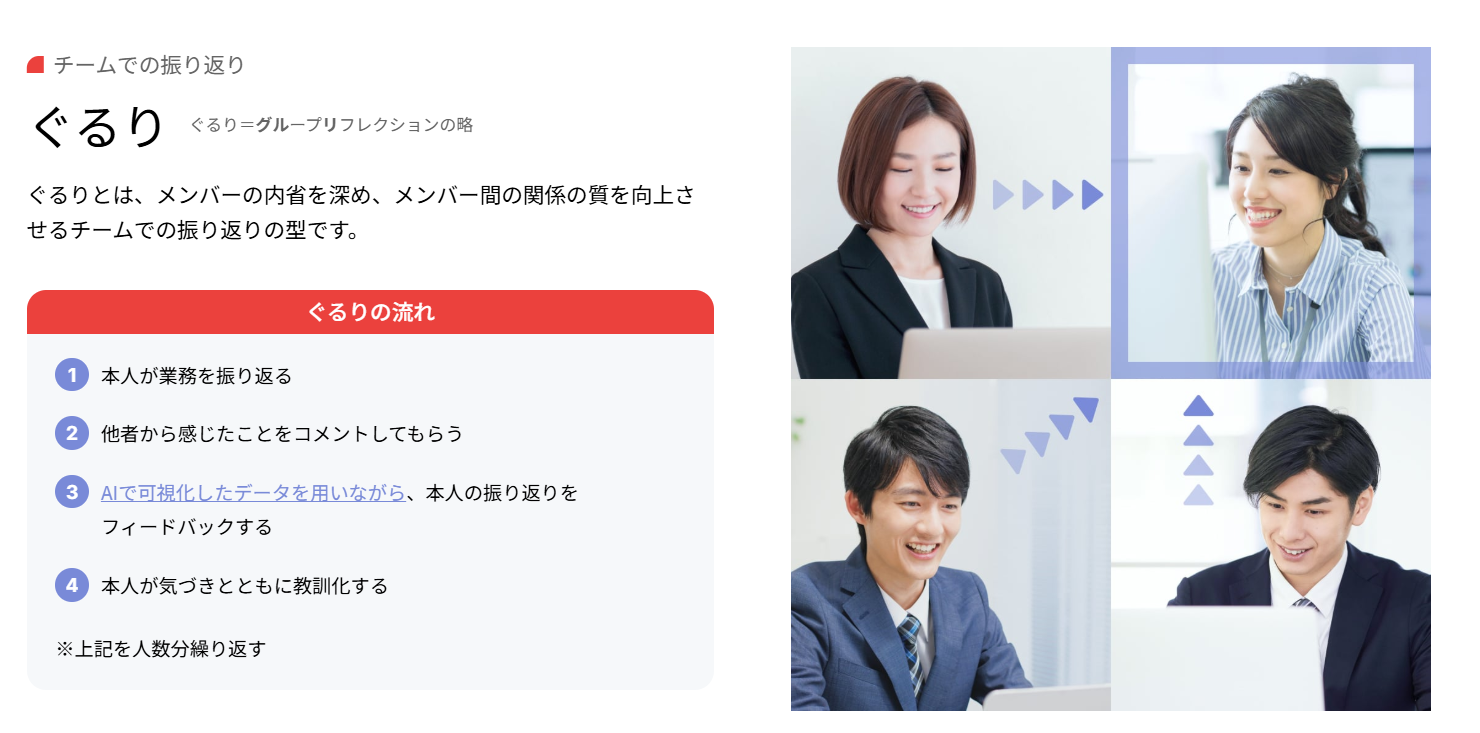 メンバーの育成やモチベーション向上を目的として、最近は1on1ミーティングを取り入れる企業も増えていますが、なぜあえてマネージャーとの1対1ではなく、「ぐるり(グループ)」が良いのでしょうか?