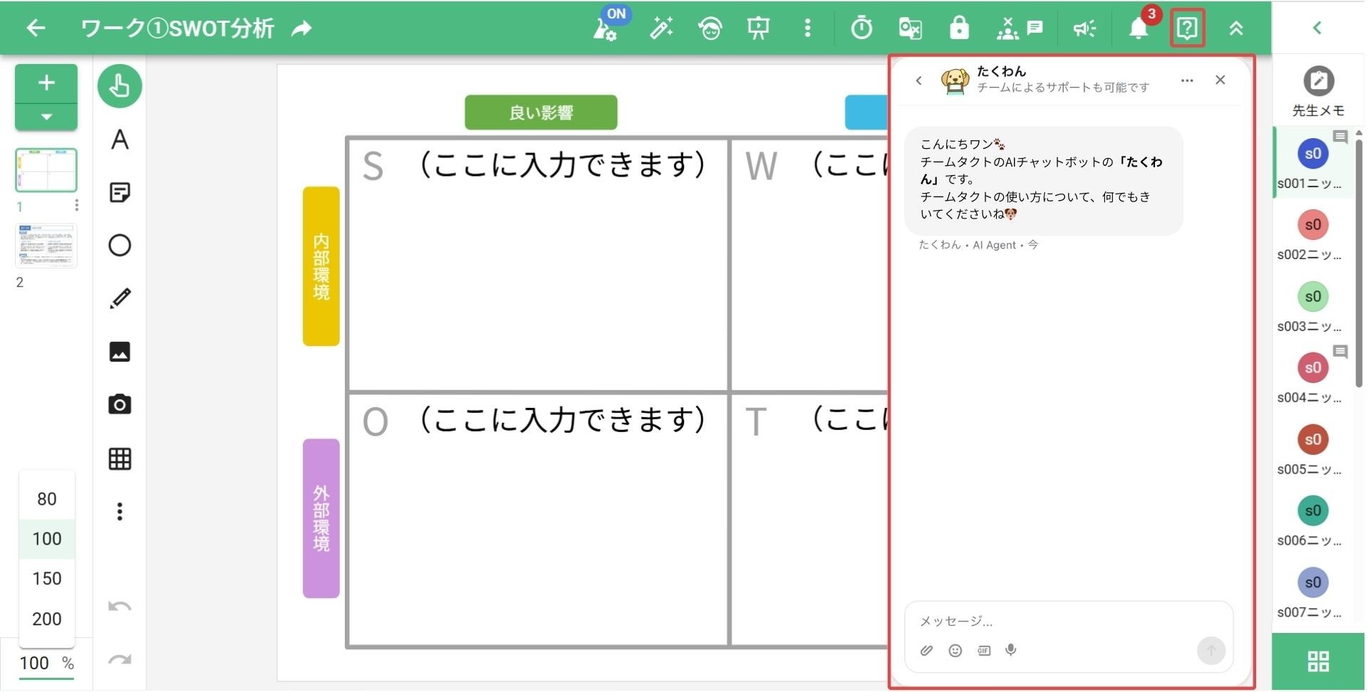 操作方法などが分からない時に、課題画面からもすぐにチャットボットに質問ができるよう、画面右上のツールバーにボタンを設置しました。ボタンからワンクリックで相談が開始でき、操作に関する個別の質問に、チームタクトのチャットボット公式キャラクターが、24時間お答えします。