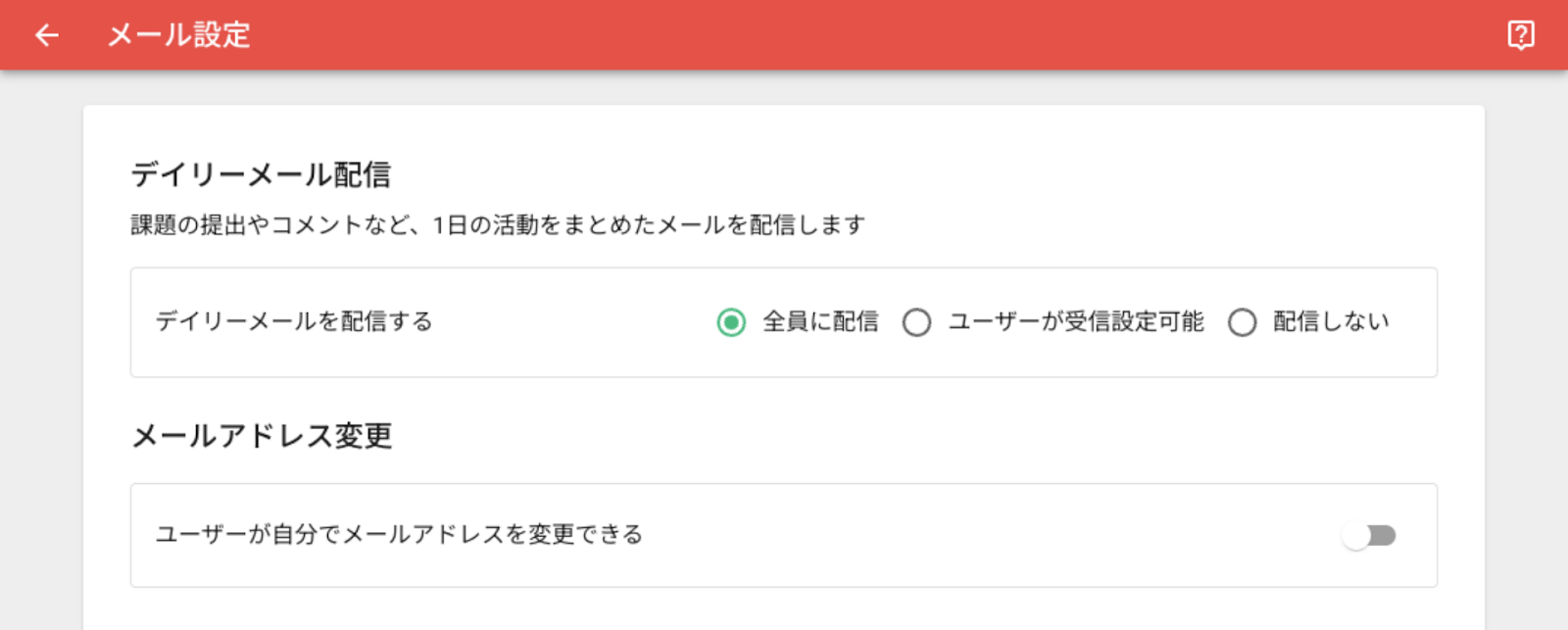 課題提出などをお知らせするデイリーメールの配信設定を、管理者が「全員に配信」「ユーザーが設定可能」「配信しない」の3つから一括で設定できるようになりました。 - メールアドレスの変更制限:
