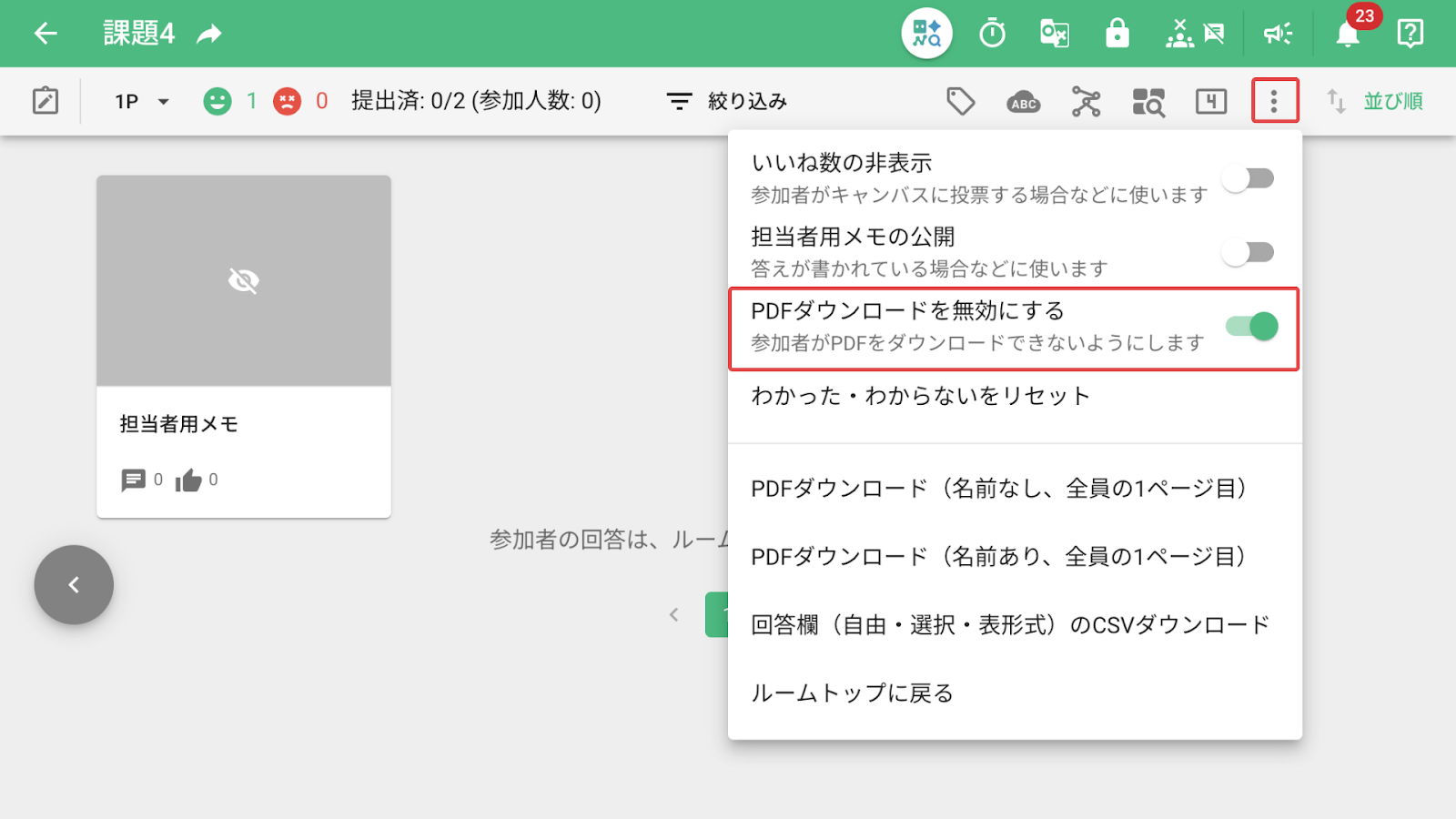参加者によるキャンバス上のPDFダウンロードを制限する管理設定を追加しました。設定は、担当者のみが行うことができ、PDFダウンロードを「無効」に設定すると、参加者画面ではPDFダウンロードに関する選択肢が非表示となります。資料の取り扱いをコントロールしたい場面などで活用できます。