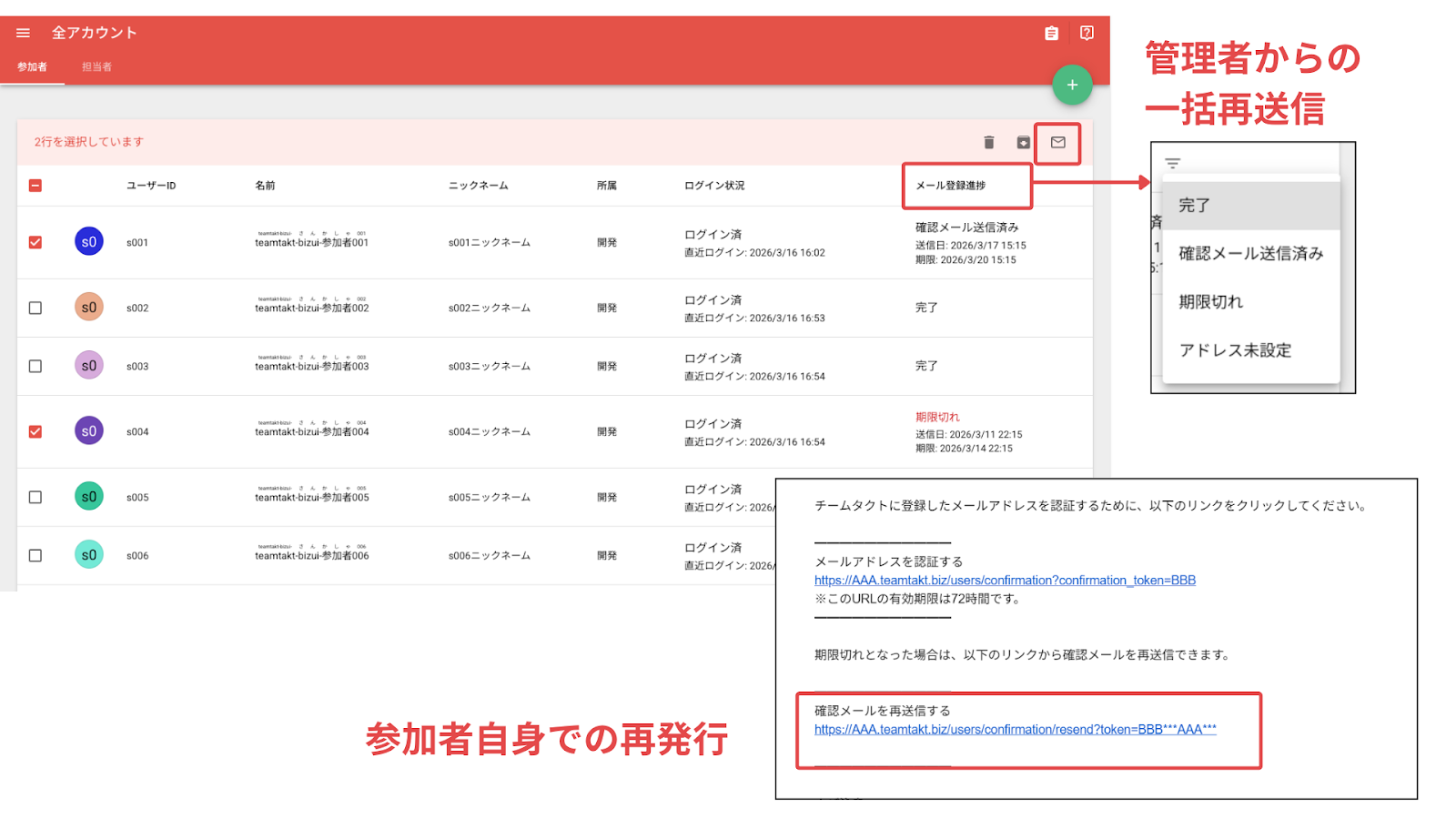 「全アカウント」画面において、メール登録進捗(未設定や期限切れなど)で対象者を絞り込み、複数人への一括送信が簡単にできるようになりました。また、特定の参加者だけを選んで、個別に確認メールを再送信することも可能です。